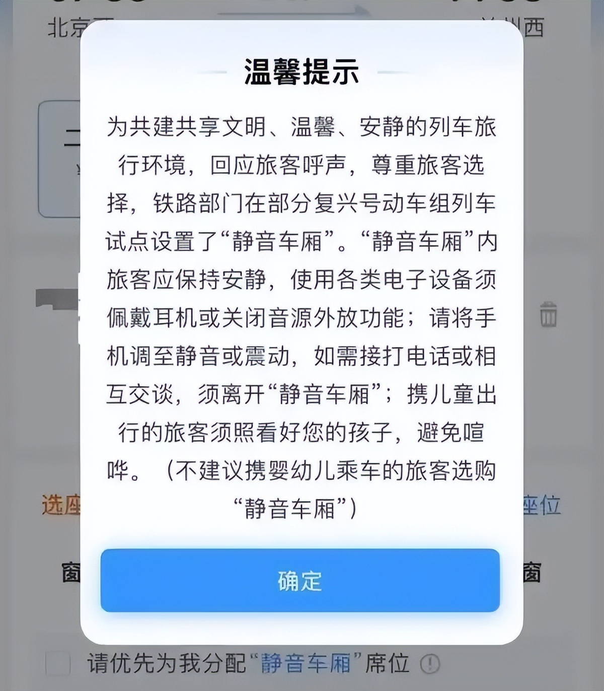 旅客在选择静音车厢后,12306APP提示:在“静音车厢”内旅客应保持安静,使用各类电子设备须佩戴耳机或关闭音源外放功能;请将手机调至静音或震动,如需接打电话或相互交谈,须离开“静音车厢”;携儿童出行的旅客须照看好您的孩子,避免喧哗(不建议携婴幼儿乘车的旅客选购“静音车厢”)。